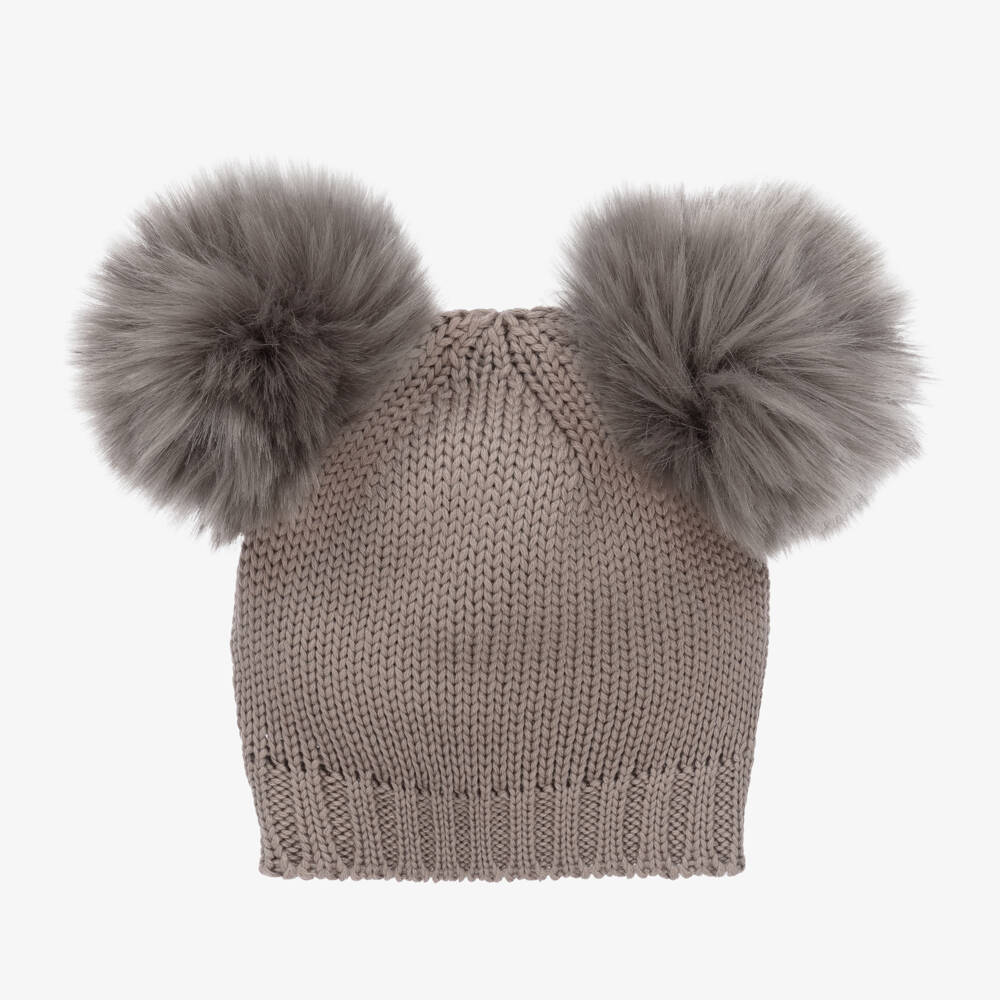 A fun grey hat for girls by Italian brand Catya, knitted in soft Merino wool. This cosy accessory has large faux fur pom-poms on the top. The ribbed edge has extra stretch for a comfortable fit and feel.