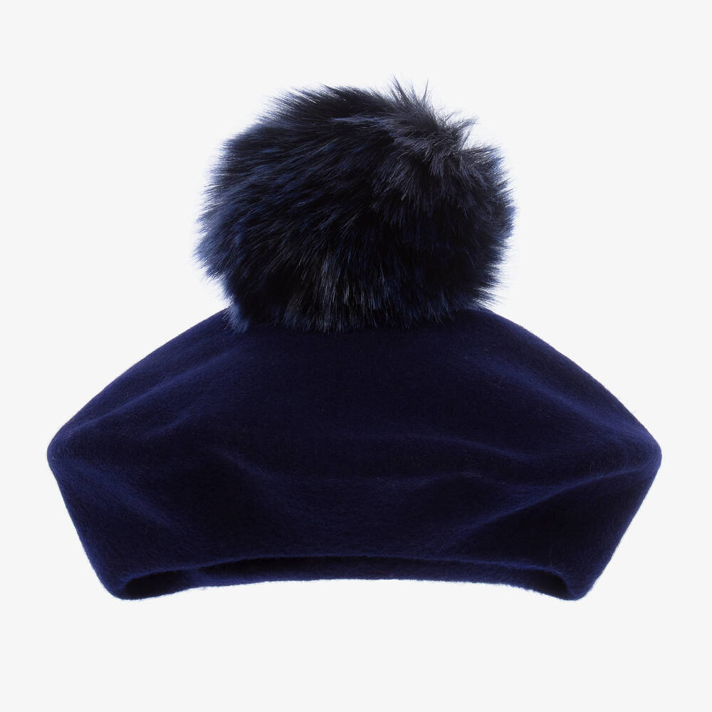 Girls navy blue beret by Italian brand Catya, made in soft felted Merino wool. A timeless way to finish an outfit, this structured beret has a traditional silhouette with a large blue faux fur pom-pom on the top.
