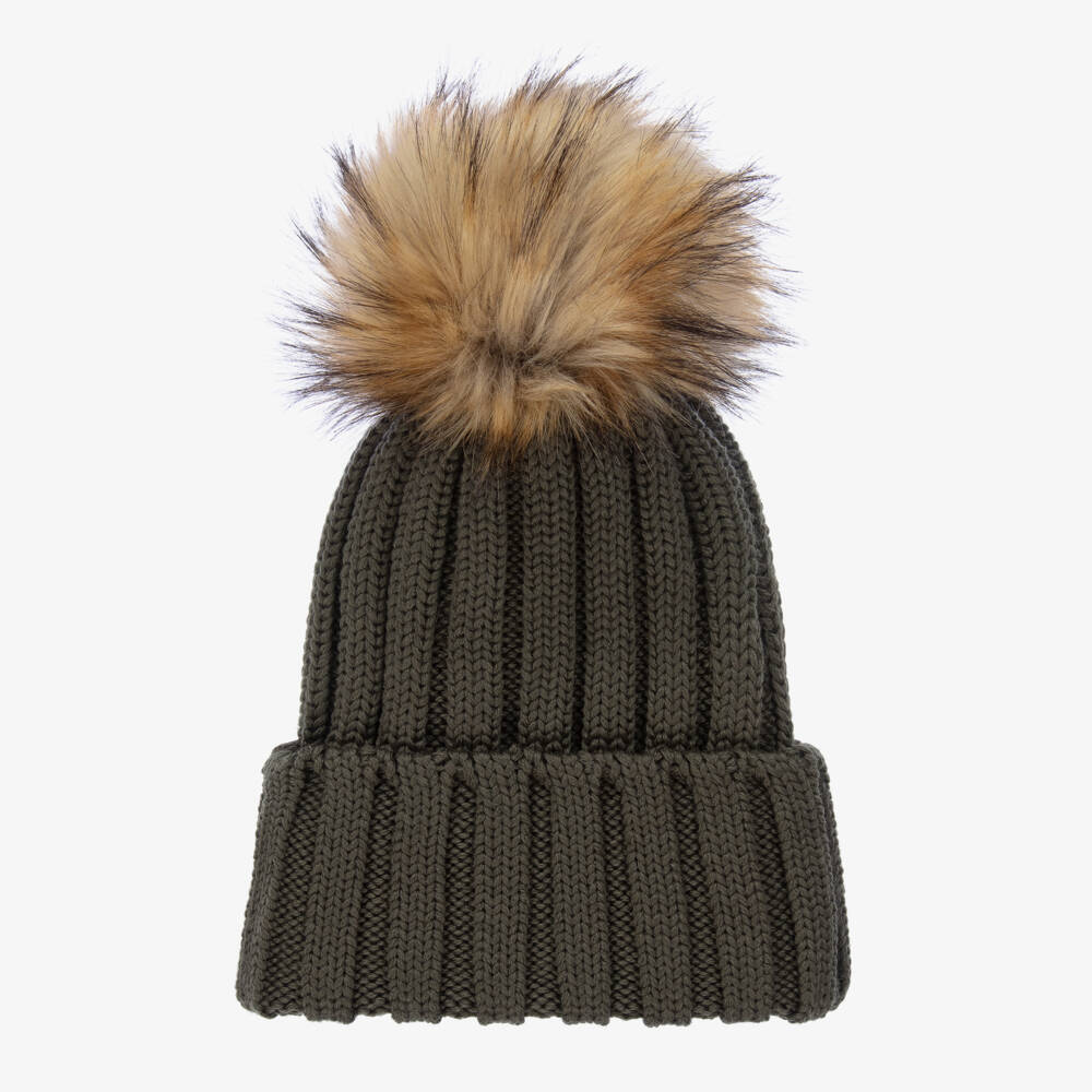 Green hat for girls by Italian brand Catya, made in Merino wool with a chunky ribbed knit. It has a fixed turn-up brim and a large beige faux fur pom-pom on top.