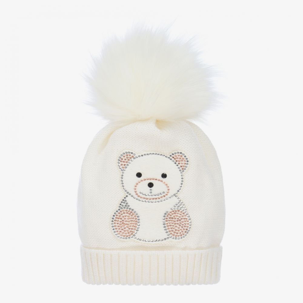 Sweet ivory hat for baby girls, by Catya. Made from beautifully soft Merino wool, it has a sweet pink and silver diamanté bear appliqué on the front and an oversized faux fur pom-pom on the top.