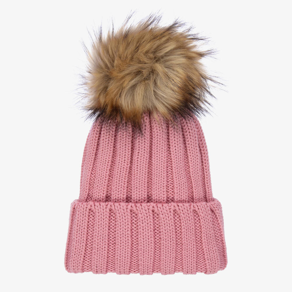 Pink hat for girls by Italian brand Catya, made in Merino wool with a chunky ribbed knit. It has a fixed turn-up brim and a large beige faux fur pom-pom on top.