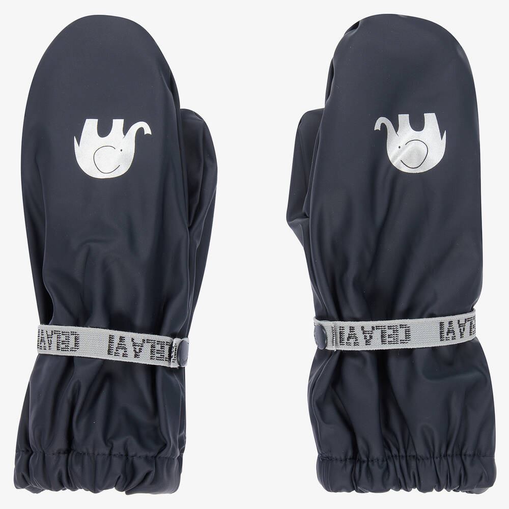Navy blue water repellent mittens for boys and girls by CeLaVi, made in soft coated fabric. For added safety, they have a light reflective elephant printed on the front, and an elasticated strap around the wrist for a secure fit. Lined in super soft fleece, they are designed to keep little hands warm and dry.