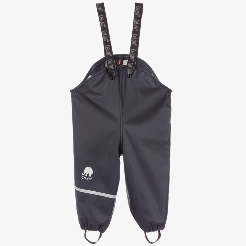 Girls and boys navy blue waterproof salopettes from Danish brand CeLaVi. They are made in smooth coated fabric, with a reflective silver logo and stripe on one leg for added safety. The branded black and white elasticated shoulder straps are elasticated and adjustable for comfort. There are poppers to adjust on both sides, with elasticated adjustable stirrups for a secure fit.