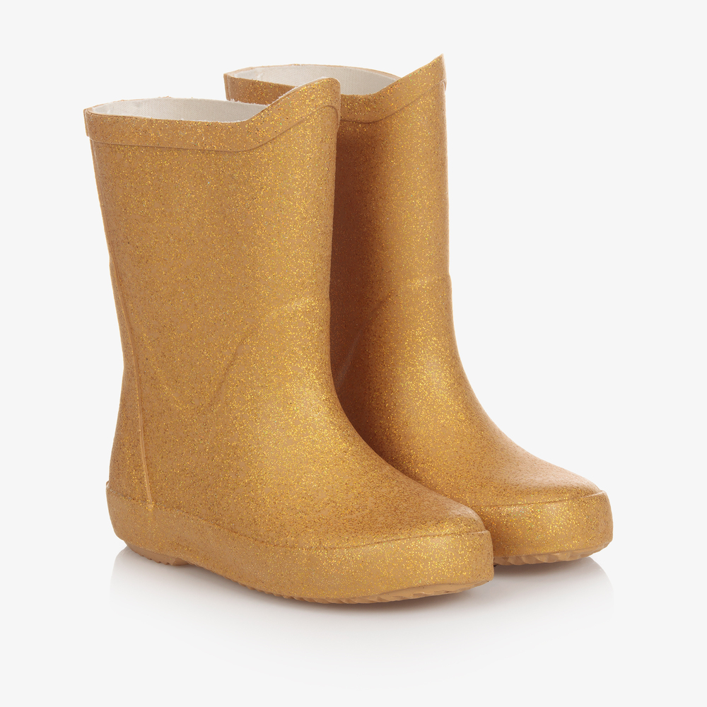 Girls glittery gold waterproof rain boots from Danish brand CeLaVi, handmade with flexible natural rubber. They are lined in fabric, with a fabric inner sole and non-slip rubber outer sole. There are reflective details and a logo on the heel.