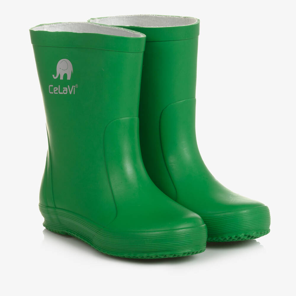 Green rain boots for boys and girls by CeLaVi, made in flexible natural rubber. They have a comfortable fabric lining, ridged soles, and light-reflective print on the heel and side for added safety.