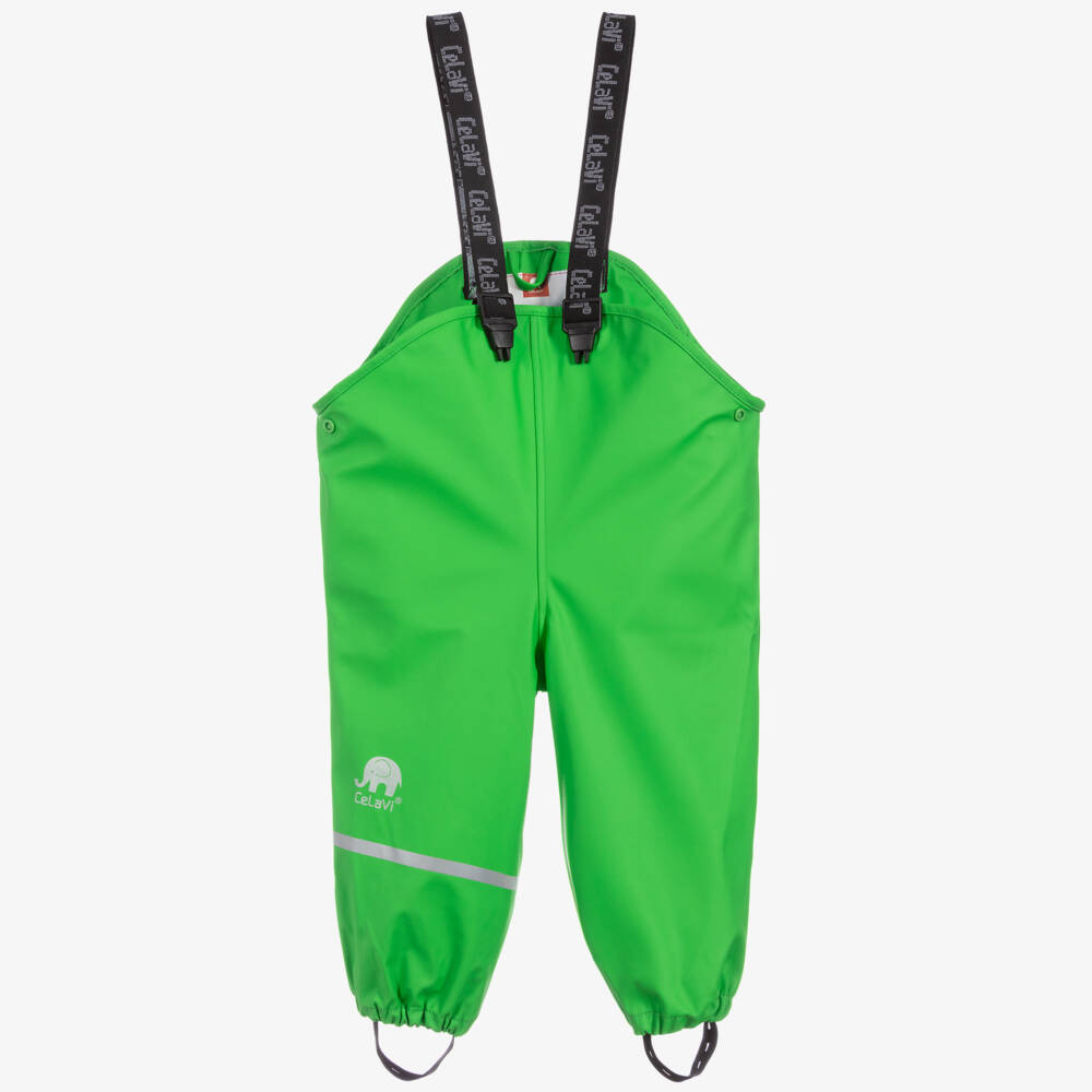 Girls and boys bright green waterproof salopettes from CeLaVi. They are made in smooth coated fabric, with a reflective silver logo and stripe on one leg. The branded black and white elasticated shoulder straps are adjustable. There are poppers to adjust on both sides, with elasticated adjustable stirrups for a secure fit.