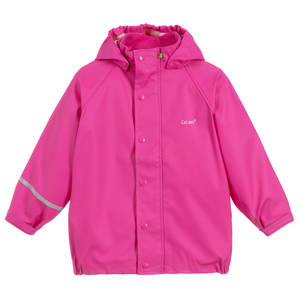 Girls and boys pink waterproof raincoat from CeLaVi. It is made in smooth PU coated polyester, with a reflective silver logo on the chest, hood and a stripe on one sleeve. It has a detachable hood, a soft fleece collar and adjustable cuffs with velcro fastening.