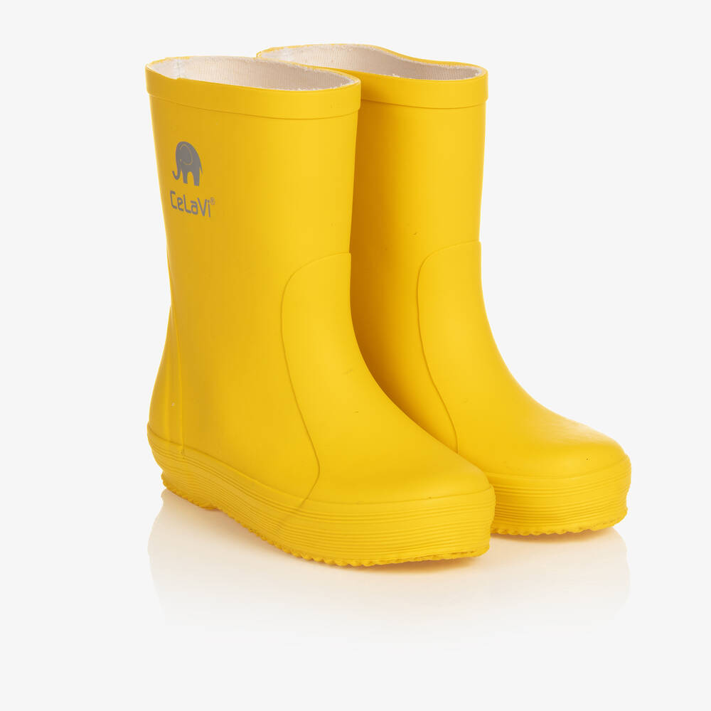 Yellow rain boots for boys and girls by Danish brand CeLaVi, made from natural rubber. They are fabric lined and have a uniquely developed sole, so are comfortable to wear and support growing feet. There are reflective trims on the heel and side for added safety.