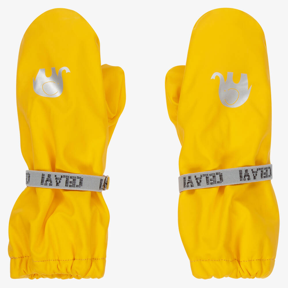 Bright yellow water repellent mittens for boys and girls by CeLaVi, made in soft coated fabric. For added safety, they have a light reflective elephant printed on the front, and an elasticated popper-fastening strap around the wrist for a secure fit. Lined in super soft fleece, they are designed to keep little hands warm and dry.