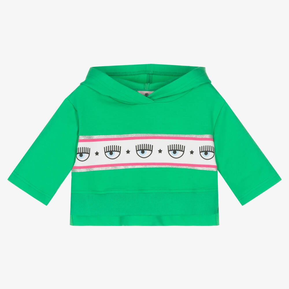 Vibrant green hooded sweatshirt for girls by Italian brand Chiara Ferragni Kids. It is made in comfortable cotton sweatshirt jersey with a cropped boxy fit, three-quarter length sleeves, and a split hem with ribbed trim at the front. The brand's iconic Maxi Logomania panel runs across the front with pink and silver glitter stripes for a distinctive finish.