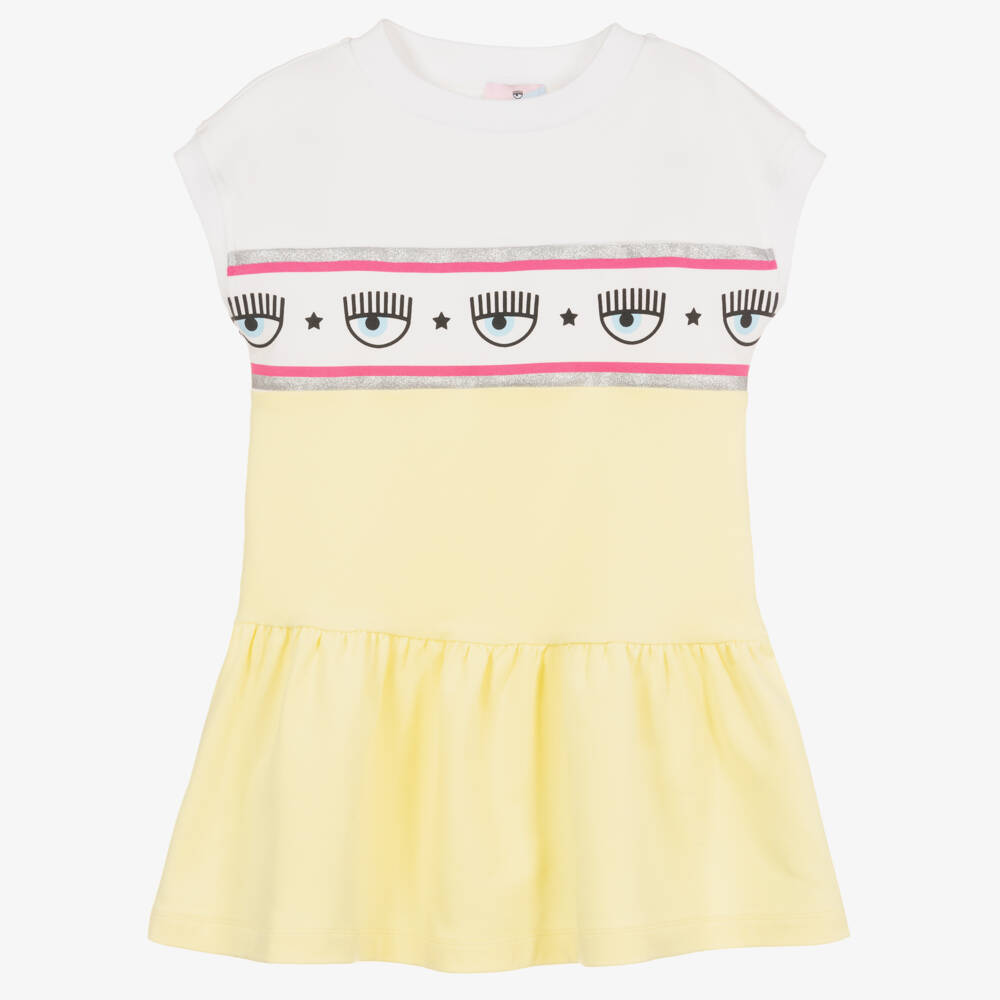 Casual yellow sleeveless dress for girls by Italian designer Chiara Ferragni Kids, made in soft cotton jersey with a looped underside. Edgy and bold, it has the brand's iconic Maxi Logomania design, with pink and glittery silver stripes on the bodice.