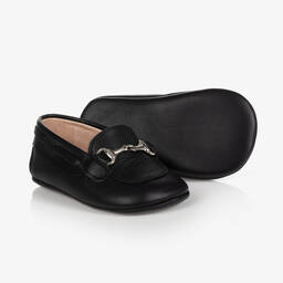 Exclusive to Childrensalon, a pair of black pre-walker shoes for baby boys and girls by Children's Classics. Made and lined in soft leather, with a slightly padded insole, these slip on shoes have soft, flexible outer soles and a metal snaffle detail on the front.