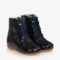 Exclusive to Childrensalon, a pair of boots for girls made in black quilted leather by Children's Classics. They have patent leather trims and a fabric lining, with a non-slip rubber sole.