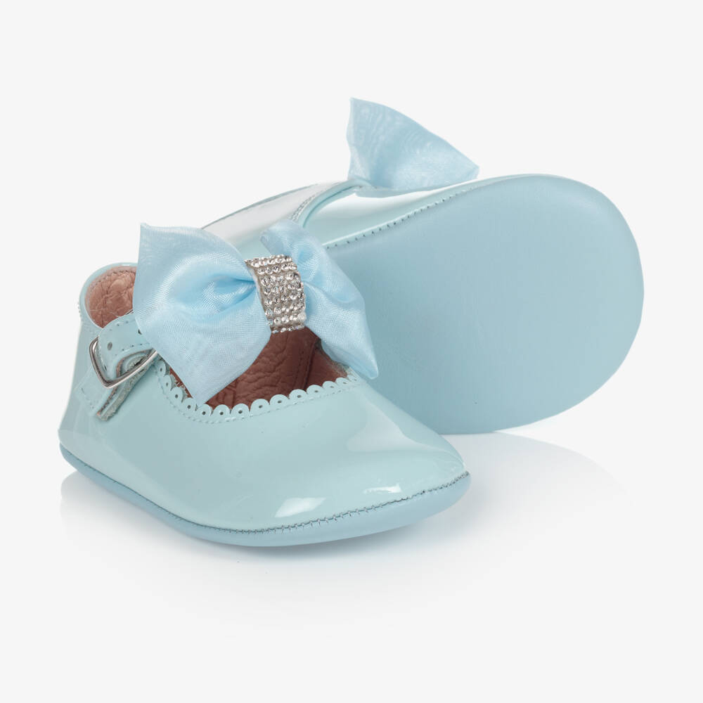 Exclusive to Childrensalon, a pair of pale blue patent leather pre-walker shoes for baby girls by Children's Classics. Made and lined in soft, supple leather, they have a detachable chiffon and diamanté bow on the buckle-fastening strap. There is pretty scallop detailing around the front and the leather soles are flexible for comfort.