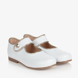 Exclusive to Childrensalon, a pair of smooth navy blue leather Mary Jane shoes for girls by Children's Classics. They have shiny gold trims, with a velcro strap across the foot and a faux gold button. They are fully lined in leather and have a non-slip outer sole.