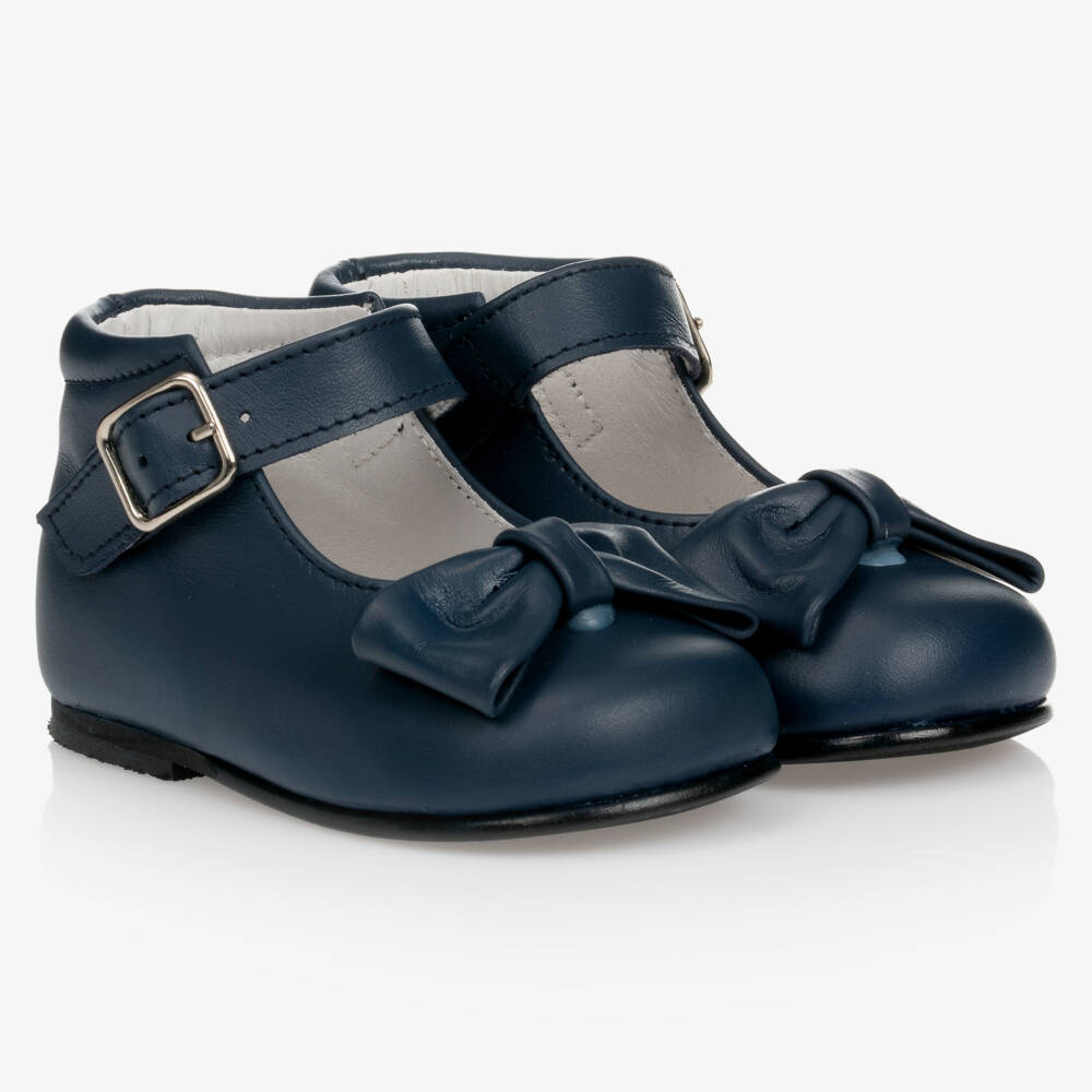 Exclusive to Childrensalon, a pair of soft navy blue leather shoes for girls by Children's Classics. They have an adorable bow on the front with an adjustable buckle strap. They are lined in soft leather, with softly padded insole and ankle support for extra comfort.