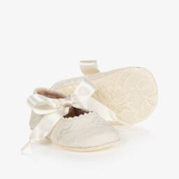 Exclusive to Childrensalon, a pair of ivory pre-walker shoes for baby girls by Children's Classics. The ideal finishing touch for a special occasion, the uppers are made from beautiful satin and lace, and they fasten with ivory satin ribbons. The shoes are lined in supple leather for comfort and have soft flexible soles.