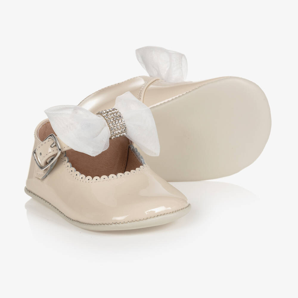 Exclusive to Childrensalon, a pair of ivory patent leather pre-walker shoes for baby girls by Children's Classics. Made and lined in soft, supple leather, they have a detachable chiffon and diamanté bow on the buckle-fastening strap. There is pretty scallop detailing around the front and the leather soles are flexible for comfort.