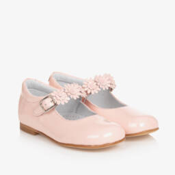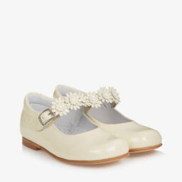Exclusive to Childrensalon, a pair of soft ivory patent leather shoes for girls by Children's Classics. These lovely Mary Jane style shoes have leather lining and cushioned insole. The straps are decorated with detachable floral appliqués and fasten with buckles on the sides.
