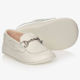 Exclusive to Childrensalon, a pair of navy blue pre-walker shoes for baby boys and girls by Children's Classics. Made and lined in soft leather, with a slightly padded insole, these slip on shoes have soft, flexible outer soles and a metal snaffle detail on the front.