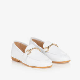 Exclusive to Childrensalon, a pair of smart white leather loafers for boys and girls by Children's Classics. Ideal for special occasions, this slip-on style is lined in soft leather with cushioned leather insoles and sleek rubber outsoles. Gold metal horse-bit details across the foot complete this stylish look.
