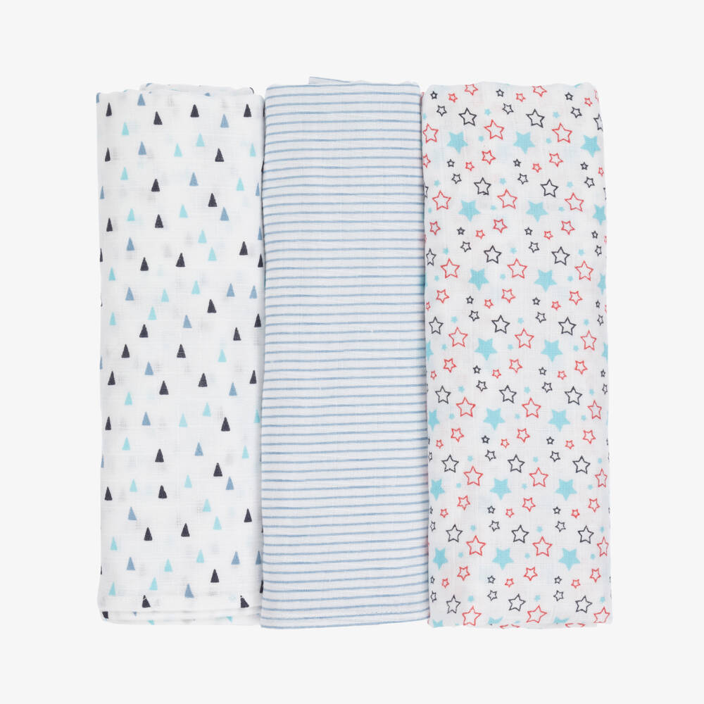 A pack of three muslins for baby boys and girls by Childrensalon Essentials, made in super soft, lightweight, off-white organic cotton. One muslin has a triangular pattern in shades of blue, another a red and blue star print, and the third is striped in blue. Useful and absorbent, they are great for cleaning up little spills or they can be used as a burping cloth or nursing cover. They are presented in fully biodegradable packaging.