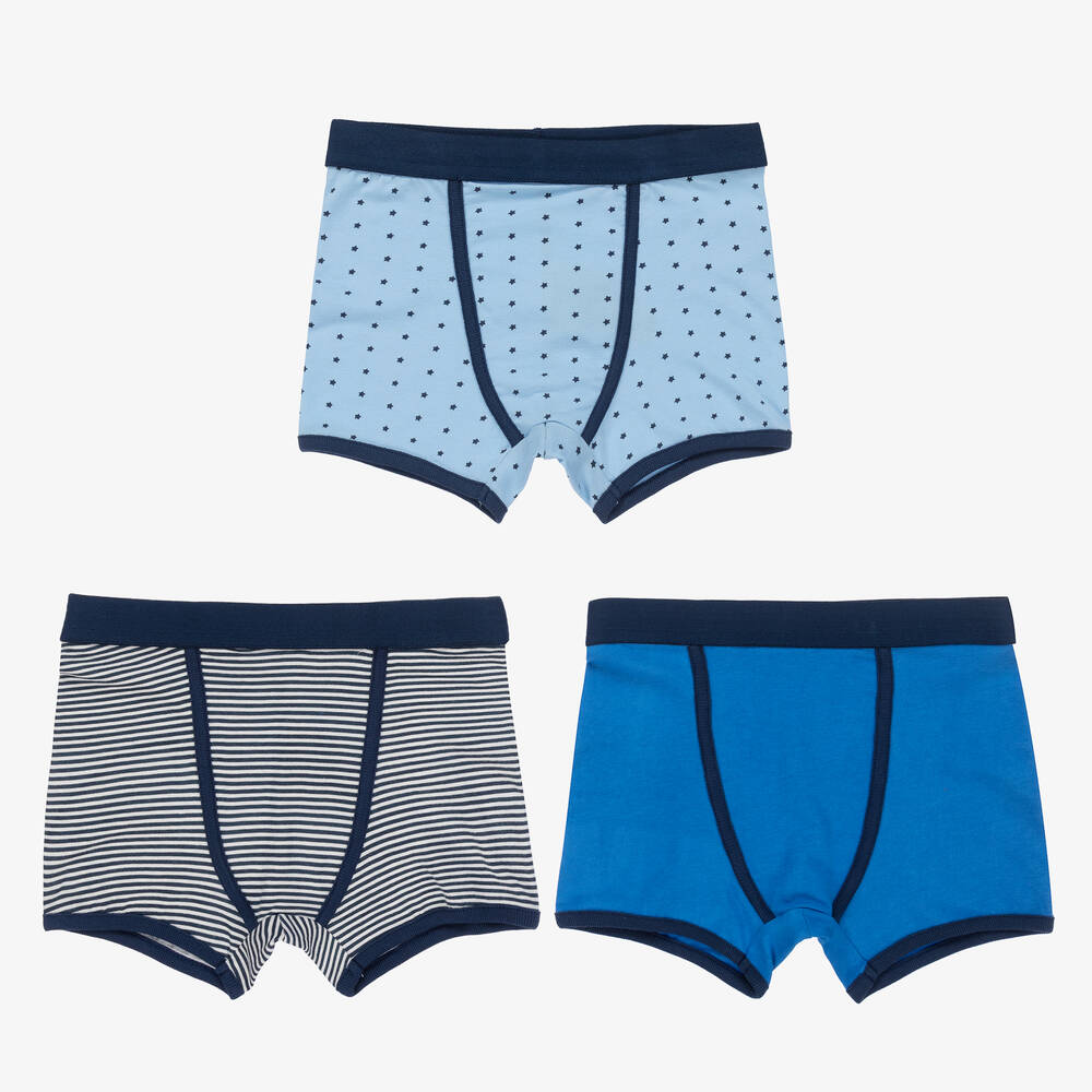 Pack of three comfortable boxer briefs for boys by Childrensalon Essentials, made in ultra-soft, stretchy organic cotton jersey with an elasticated waistband. One pair has navy blue Breton stripes, while one pair is light blue with stars and the other is plain mid-blue. The set is presented in fully biodegradable packaging.
