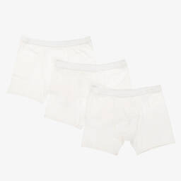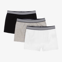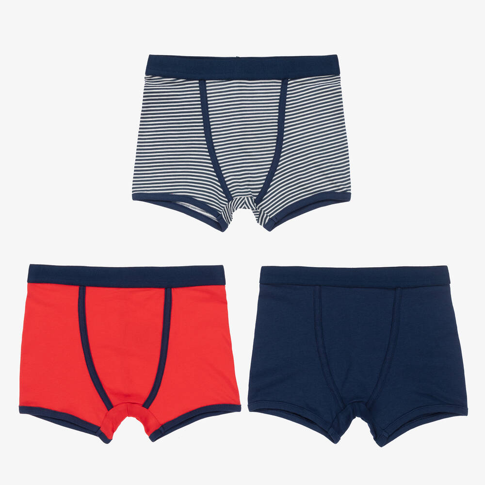 Pack of three comfortable boxer briefs for boys by Childrensalon Essentials, made in ultra-soft, stretchy organic cotton jersey with an elasticated waistband. One pair has navy blue Breton stripes, while one pair is plain navy blue and the other is red. The set is presented in fully biodegradable packaging.