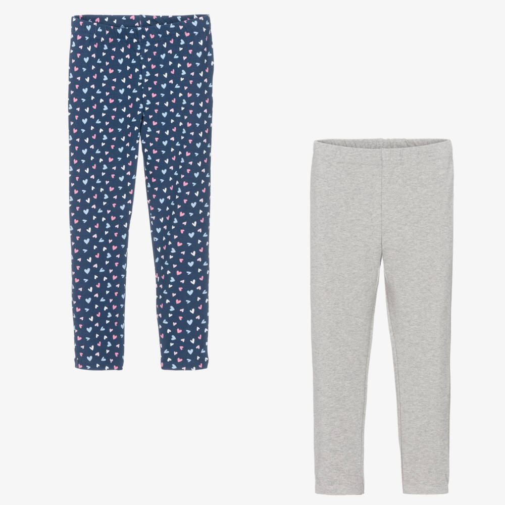 Two pairs of navy blue and grey leggings for girls by Childrensalon Essentials, made in soft, stretchy organic cotton jersey. The navy blue pair has a pretty hearts pattern in pink, blue and white, whilst the other pair is in grey marl. Full length, the waistband is gently elasticated for comfort.
