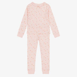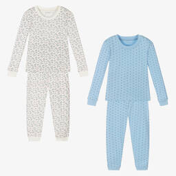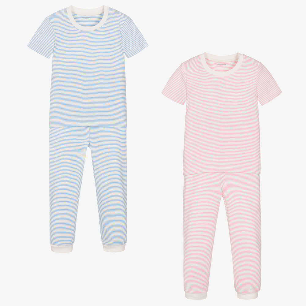 Two pack of ivory long pyjamas for girls by Childrensalon Essentials, made in soft organic cotton jersey. One pair is striped in pale pink, whilst the other is striped in pale blue. Both pyjamas have short sleeves, ivory, ribbed trims and a comfortable elasticated waist. They come packaged in a fully biodegradable bag.