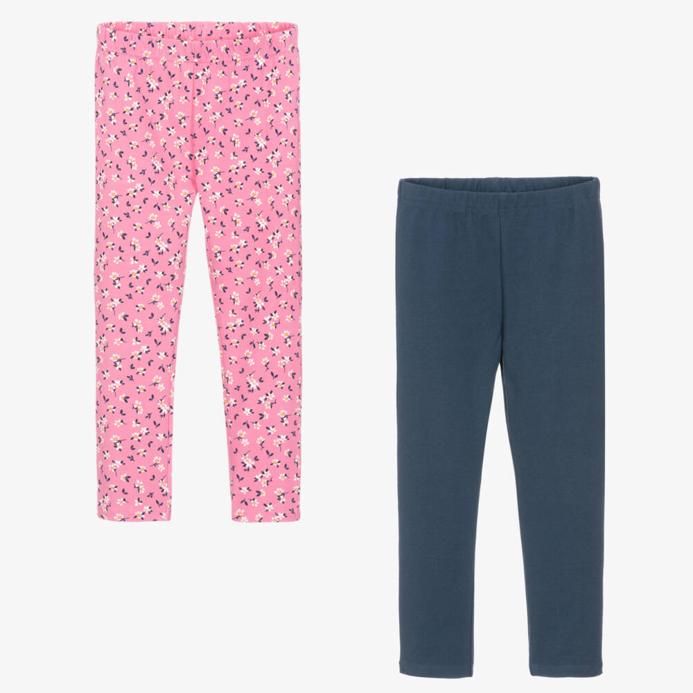 Two pairs of pink and blue leggings for girls by Childrensalon Essentials, made in soft, stretchy organic cotton jersey. The pink pair has a pretty floral pattern in blue and white, whilst the other pair is in navy blue. Full length, the waistband is gently elasticated for comfort.