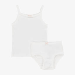 This pretty pink floral vest and knickers set for girls, in-house designed by Childrensalon Essentials. Made in soft organic cotton jersey with a delicate pointelle pattern in the weave, both pieces are trimmed with delicate picot edging and a pink grosgrain bow.