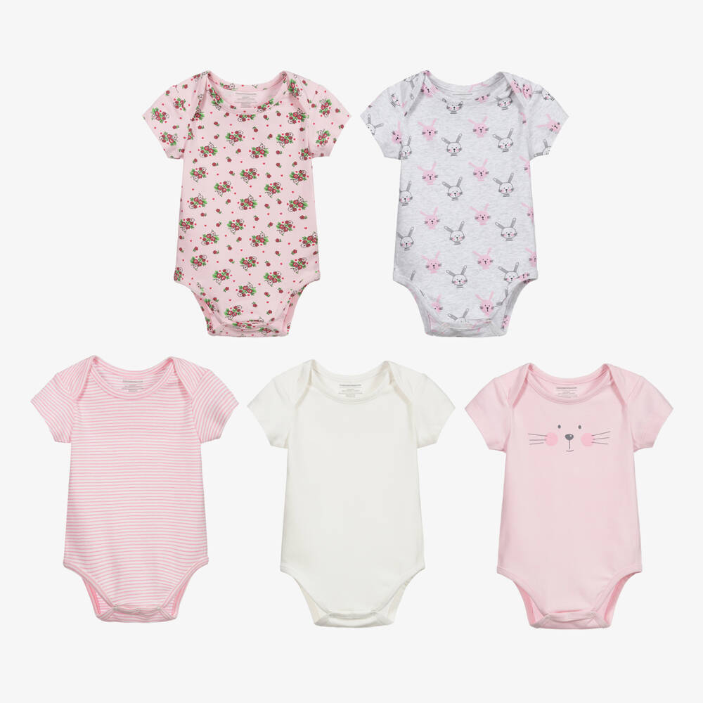 Pack of five organic cotton bodyvests for baby girls by Childrensalon Essentials. They are made in beautifully soft, pink, grey or ivory jersey, patterned with cute bunnies, flowers or stripes. All the bodyvests have useful envelope necklines and popper fastenings between the legs. They are presented in fully biodegradable packaging.