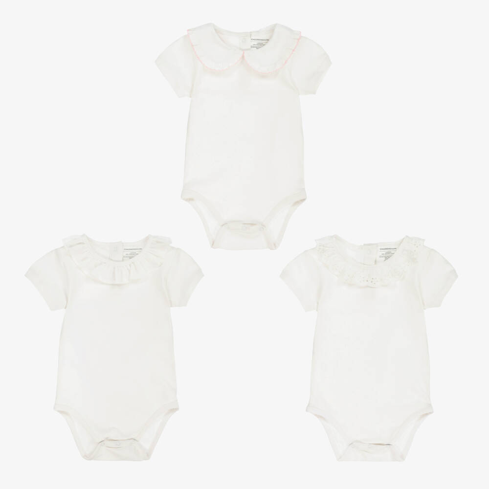 A pack of three off-white organic cotton bodysuits for baby girls by Childrensalon Essentials, with short sleeves. They are made in beautifully soft jersey with a touch of elastane for comfort and stretch, and are presented in fully biodegradable packaging. They have differently designed collars, one with a frilly pink picot trim, one with pretty broderie anglais detailing and the other with a ruffled effect. They all have popper fastenings on the back and between the legs.
