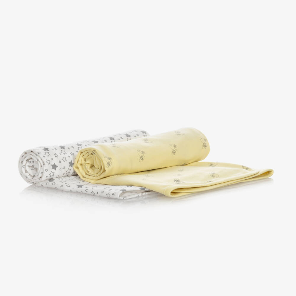 Pack of two organic cotton jersey blankets for baby girls and boys by Childrensalon Essentials. Made in beautifully soft jersey, the yellow blanket has a cute bee print, whilst the off-white one has a grey star motif. They are presented in fully biodegradable packaging.