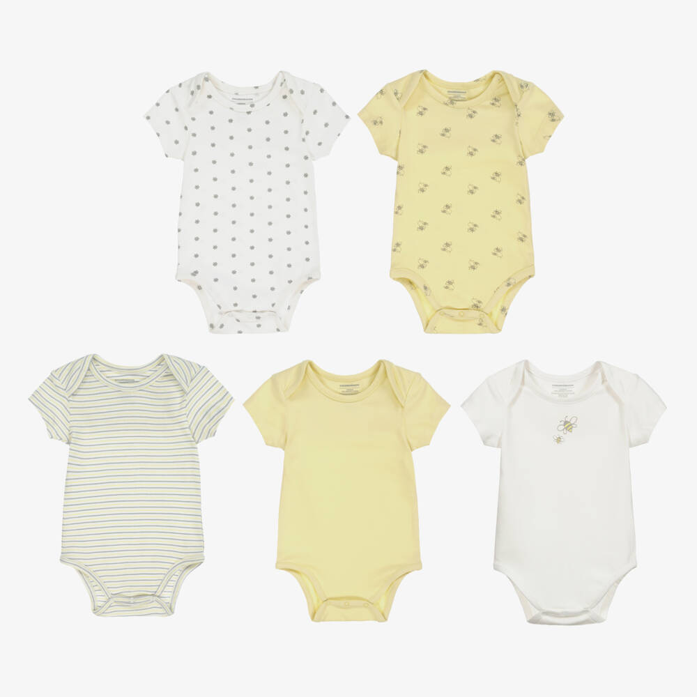 Pack of five organic cotton bodyvests for baby boys and girls by Childrensalon Essentials. They are made in beautifully soft yellow or ivory jersey, patterned with cute bees, flowers or stripes. All the bodyvests have useful envelope necklines and popper fastenings between the legs. They are presented in fully biodegradable packaging.