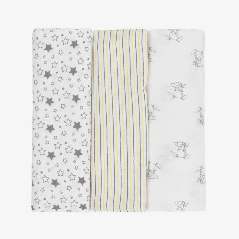 A pack of three muslins for baby boys and girls by Childrensalon Essentials, made in super soft, lightweight, off-white organic cotton. One muslin has an adorable grey bunny print, another a grey heart print, and the third is striped in yellow and grey. Useful and absorbent, they are great for cleaning up little spills or they can be used as a burping cloth or nursing cover. They are presented in fully biodegradable packaging.