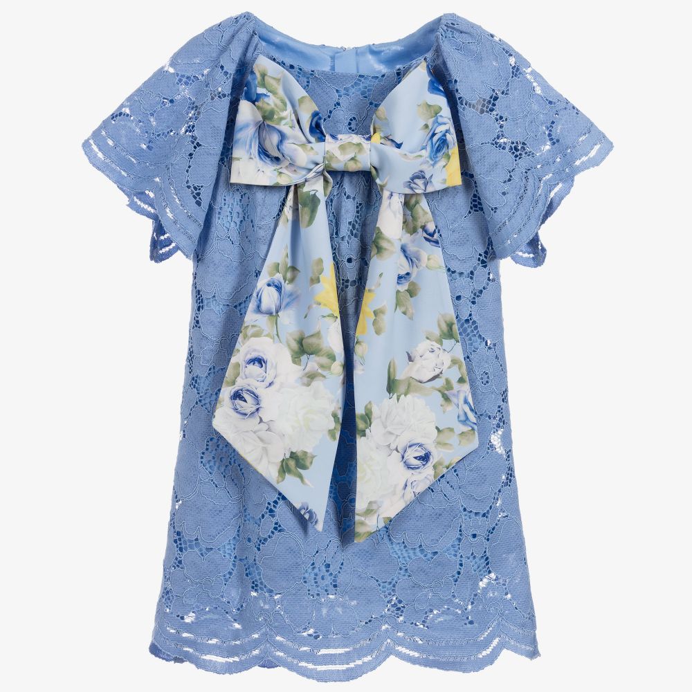 A beautiful blue lace dress for girls by Childrensalon Occasions, just right for a special event. Lightly gathered and with pretty, scalloped trims, it has a statement blue floral crêpe bow on the front, secured with poppers. The short sleeves are full and floaty and there is a discreet, concealed zip fastening on the back. The dress has a lightweight cotton lining for comfort.