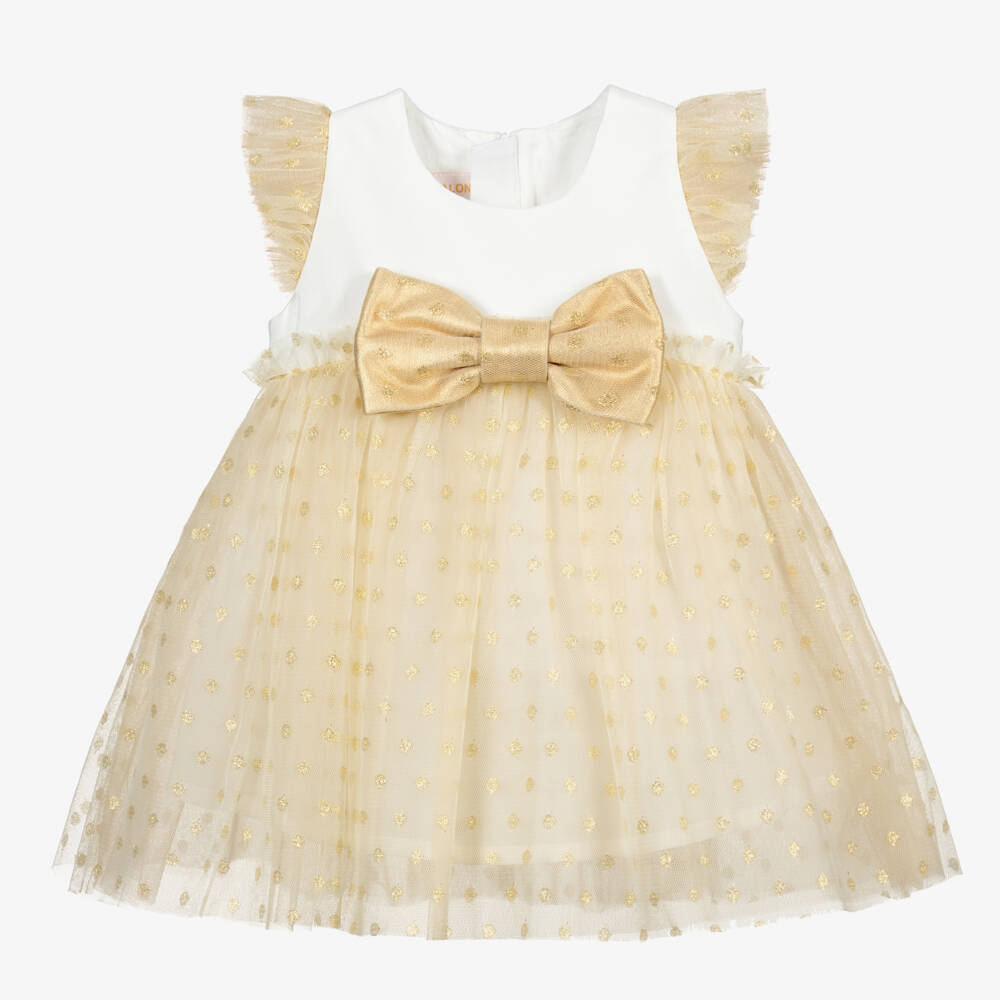 Beautiful glittery gold dress for younger girls by Childrensalon Occasions, just right for special events. The ivory satin bodice has pretty gold tulle ruffles over the shoulders, patterned with shiny gold dots. The skirt has a gold satin bow on the frilled waist, with a coordinating tulle overlay. The dress fastens on the back with a neat, concealed zip and is fully lined in cotton for comfort.