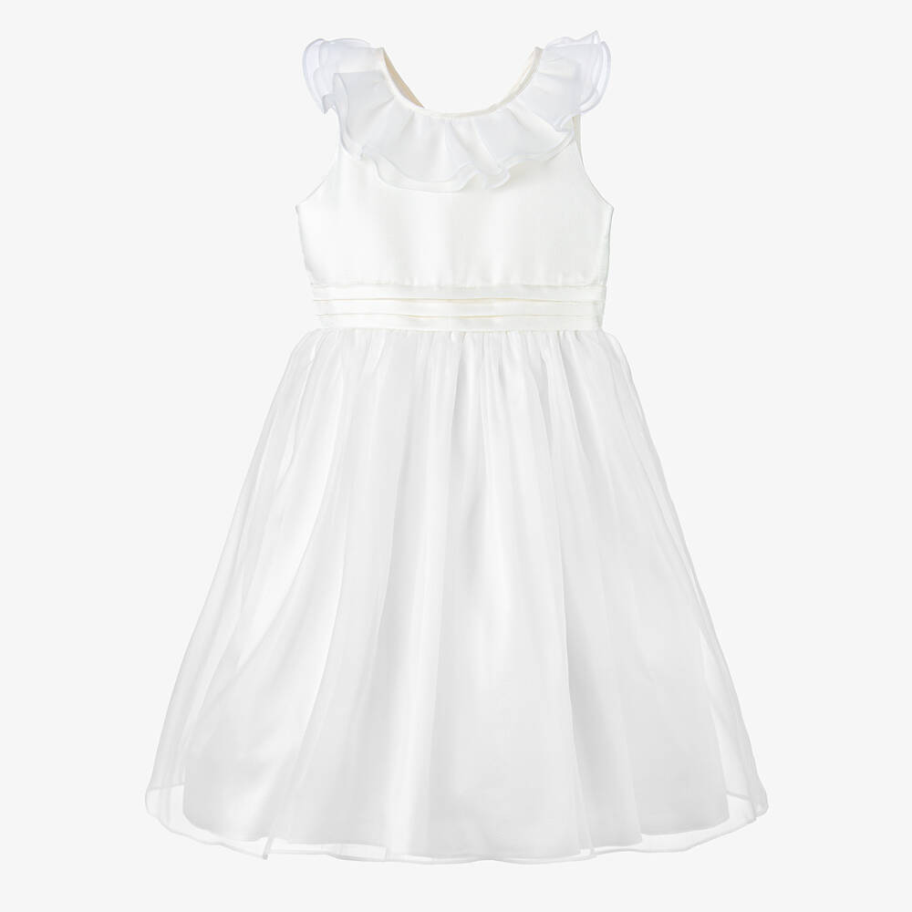 Beautiful ivory dress for girls by Childrensalon Occasions, ideal for a special event. The shimmering satin twill bodice has a large layered, ruffled organza collar and a pleated waistband, with a wonderfully oversized, detachable organza bow around the back, secured with poppers. The full, gathered satin skirt has an organza overlay, with a frilled underlayer of tulle for extra volume and a full silhouette. It is fully lined in lightweight cotton voile for comfort, with a neat, concealed zip around the back.