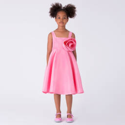 Beautiful pink jacquard dress for girls by Childrensalon Occasions, with a large, oversized bow on the back, secured with poppers, just right for making an entrance in. Made in sheer, double fabric with a jacquard effect, it has large, puffed sleeves and a gathered skirt, creating a full silhouette. The dress is lined in lightweight cotton voile and fastens with a discreet, concealed zip on the back.