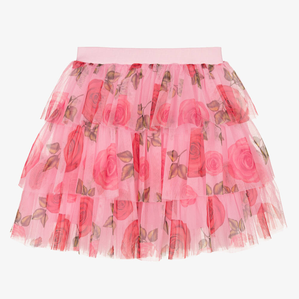 Beautiful pink skirt for girls by Childrensalon Occasions, made in soft, tiered tulle with a red and green rose pattern. It has a stretchy pink, elasticated waistband for a good fit and a cotton voile lining for comfort, with tulle underlayers for extra volume and swish.