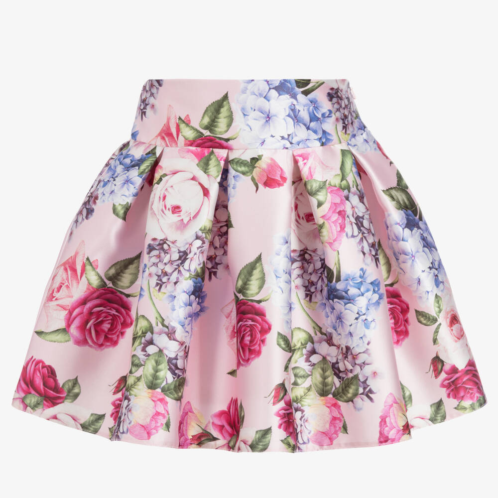Beautiful pink skirt for girls by Childrensalon Occasions, with a lovely pink rose and blue hydrangea print. Made in silky satin, it has large box pleats all around, creating lots of volume. There is a useful adjustable waistband for a great fit and a discreet, concealed side zip fastening. It is lined in lightweight cotton for comfort.