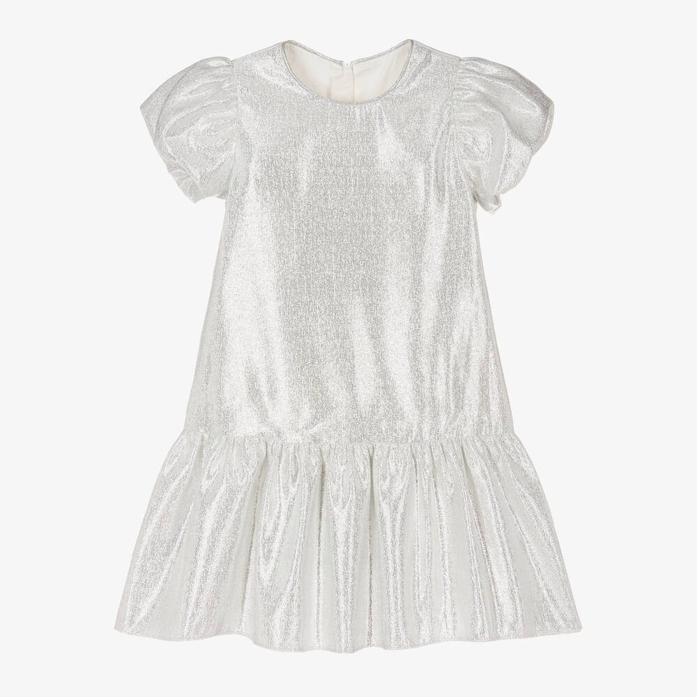 Shiny, textured silver dress for girls by Childrensalon Occasions, just right for making an entrance at any celebration. The pretty, puffed sleeves have gently elasticated cuffs for extra volume and comfort, and the dropped waist has a gathered skirt below. Lightweight and comfortable, it is fully lined in voile and has a discreet, concealed zip fastening on the back.