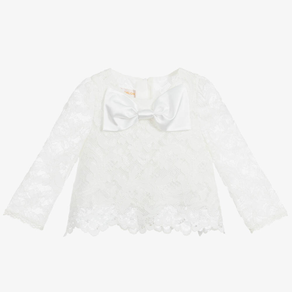 A chic, white blouse for girls by Childrensalon Occasions, with a large, fixed satin bow on the front. Made in beautifully soft lace with shimmery thread, it has three-quarter-length sleeves, a scalloped hemline and a lightweight cotton lining for comfort.
