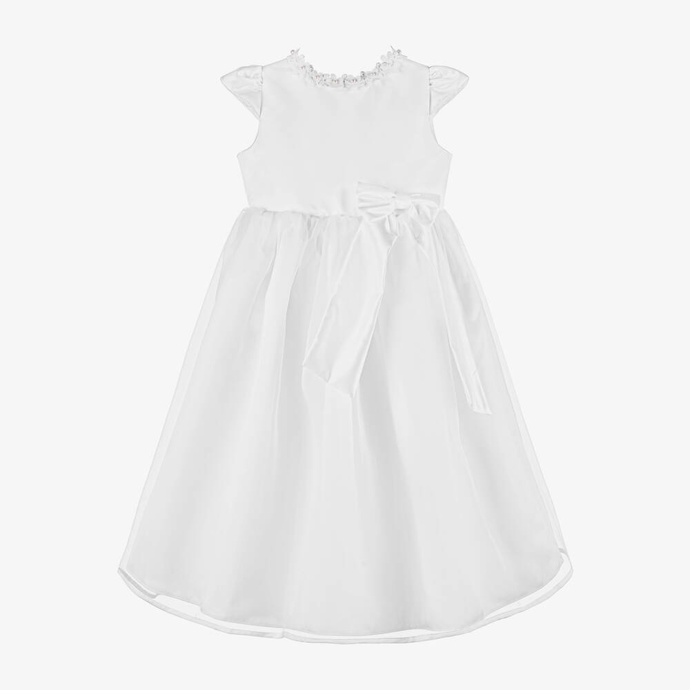A wonderful white dress for girls by Childrensalon Occasions, ideal for a special event. Made in sumptuous satin, it has a beautiful floral appliqué trim around the neckline in lace and organza, embellished with pearl beads. There are pretty, capped sleeves and a fixed, large bow on the waistline in satin. The full, gathered satin skirt has an organza overlay, with an underskirt of tulle for extra volume and a full silhouette. It is fully lined in lightweight cotton voile for comfort, with a neat, concealed zip around the back, covered by decorative satin buttons for a designer finish.