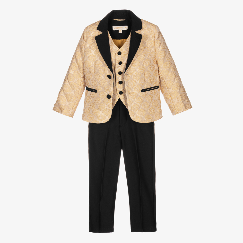 Opulent four piece suit for boys and girls by Childrensalon Occasions, exclusive to Childrensalon. The gold brocade jacket and waistcoat are lined in sumptuous satin and have black trims, with faux pockets and fabric covered button fastenings. The smart black trousers are lightweight with a subtle sheen. They have slanted front pockets, button fastenings on the back pockets and a useful, adjustable waistband on the smaller sizes for a comfortable fit. The suit comes with a smart black bow tie, that has an elasticated, adjustable strap.