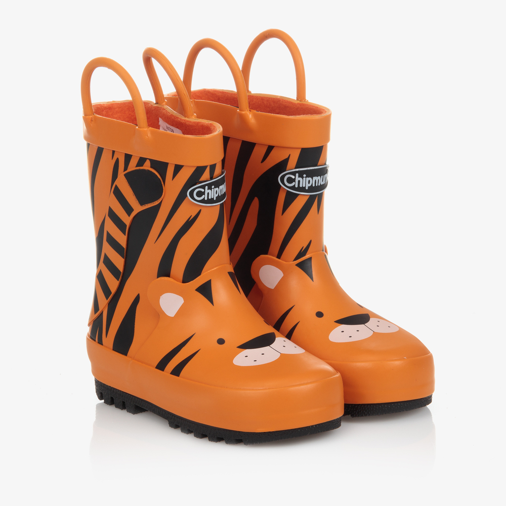 Girls and boys orange Anton Tiger rain boots by Chipmunks, made of waterproof natural rubber. The lining and inner sole are in soft fleece for insulation, keeping feet warm and toasty. They are handcrafted to look like cute tigers and have chunky black outer soles. Smaller sizes have handles on the sides so they can be pulled on easily.