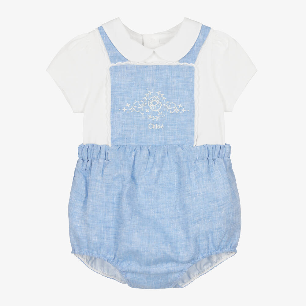 Ivory and blue dungaree shorts set for baby girls from luxury brand Chloé. The top is made in soft and stretchy cotton jersey, with a classic rounded collar, a subtle ivory embroidered logo on the front and easy-to-fasten poppers on the back for fuss-free dressing. Delicately embroidered and signed with the label's logo embroidery in ivory, the soft and lightweight linen dungarees are trimmed with sweet scalloped trims on the bib and adjustable straps. Lined with comfortable cotton, they fasten with poppers between the legs for quick changing. Presented in a branded box, the set would make a wonderful gift.