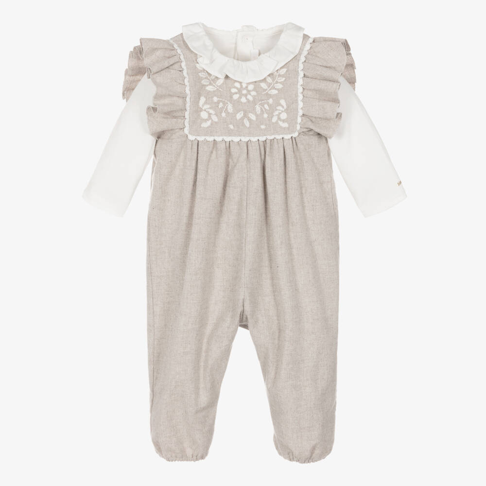 A gorgeous ivory and grey cotton dungaree set for baby girls by luxury designer Chloé. The flannel dungarees have floral and scalloped embroidery on the chest, with ruffle-trimmed shoulders. Fully lined, there is a concealed zip fastening on the back and poppers securing between the legs. It pairs beautifully with the jersey bodysuit, which has a ruffled collar and a signature Chloé logo in gold foil. It fastens usefully with poppers on the back and between the legs.